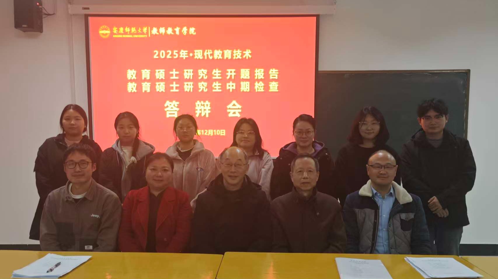为强化研究生培养过程管理,严把学位论文质量关,切实提升教育硕士人才培养的针对性与实效性,12月10日下午,太阳成城集团现代教育技术专业开展教育硕士开题报告与中期检查专项工作。本次活动邀请基础教育一线教育专家江浩(安庆市现代教育技术中心,正高级教师)、王志萍(安庆市第十四中学,高级教师),以及校内教师韩建华、韦伟、朱斌彬、方申荣组成评审小组。现代教育技术专业全体研究生和教育技术学专业部分本科生参加活动。