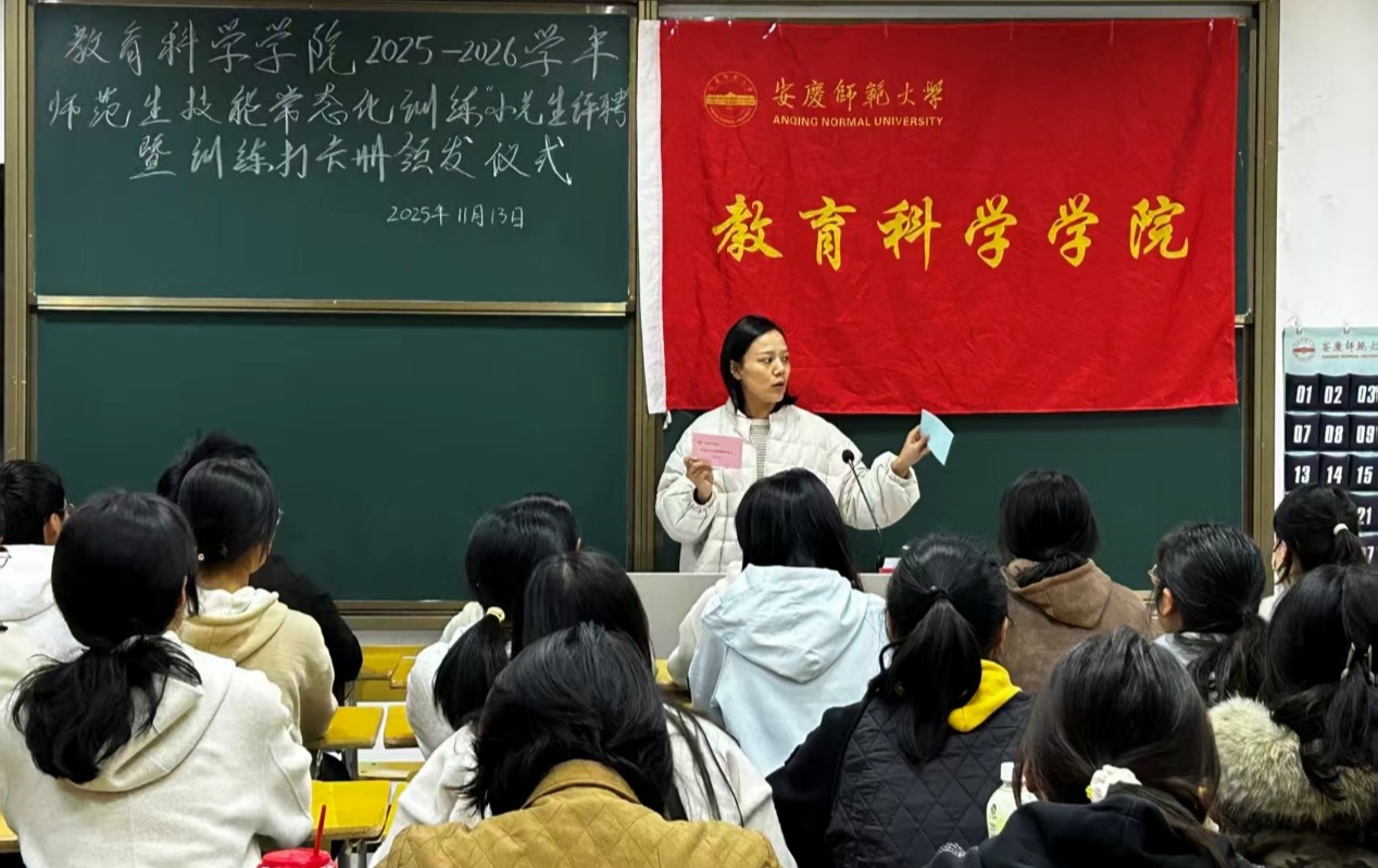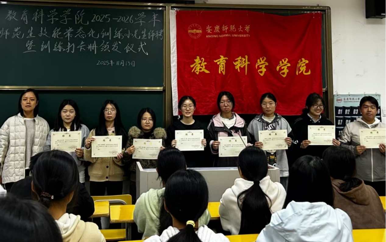 11月13日,太阳成城集团在J104教室开展2025-2026学年师范生技能常态化训练“小先生”评聘暨训练打卡册颁发仪式。院团委副书记姚强诚、新聘任的“小先生”们及2025级新生班委们到场参加。